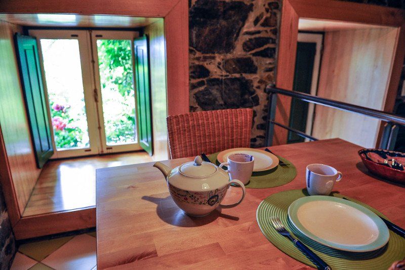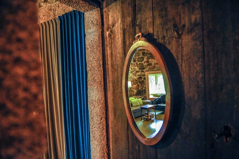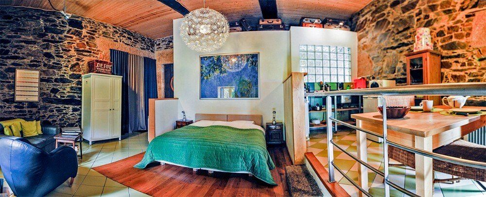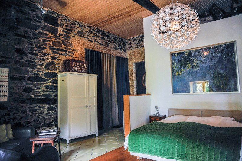 De natuurstenen buitenmuur van het huis is zichtbaar gebleven en boven het bed hangt een grote kroonluchter. De moderne badkamer heeft een wastafel, toilet en een ruime, luxe regendouche.